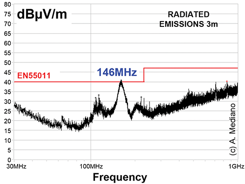 未能遵守原系統(tǒng)的規(guī)定(綠色痕跡)位于145兆赫左右。該產(chǎn)品的天線是主電源電纜(電纜的運(yùn)動和一個大的環(huán)形鐵氧體來證實這一點)。
